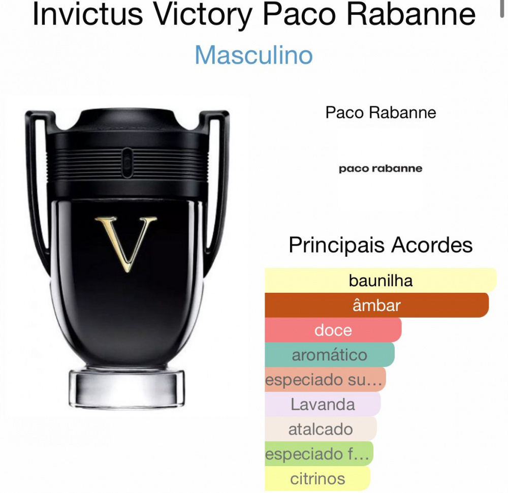O clima está ficando intenso e perder não é uma opção. Buscar proezas e realizar seus objetivos valem a pena. Testar os limites ao extremo, superar todos os desafios e vencer esplendidamente - é o início de uma obsessão pela vitória. No auge da busca pelo poder, Invictus Victory , o novo perfume importado masculino de Paco Rabanne da linha Invictus, desperta ainda mais a gana pela vitória e o sucesso. O Eau de Parfum extremo provoca um verdadeiro impacto sensorial. Neste duelo intenso, duas forças se enfrentam: a refrescância e a sensualidade. Paco Rabanne sublima duas associações exclusivas, garantindo uma fragrância de longa duração e alta fixação neste oriental refrescante.